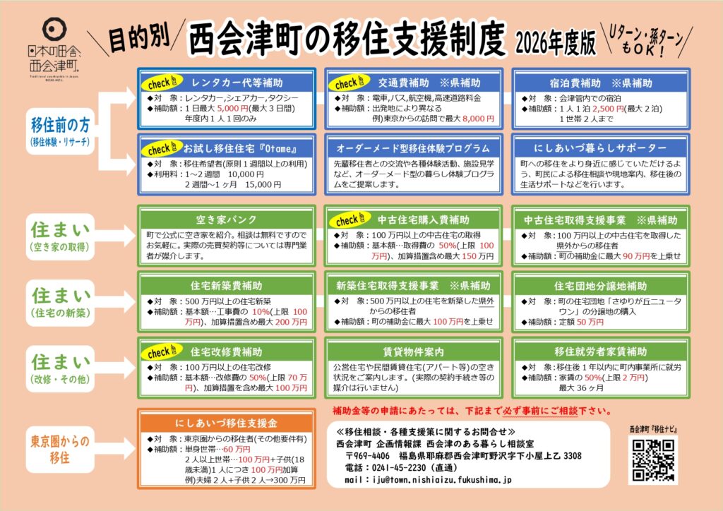 地方移住や都市との田舎の二地域居住など、新しい暮らし方を探している方やUターンを希望している方など、 西会津町で自分らしい暮らしをつくりあげて いくお手伝いをしています。住まい(賃貸アパート、空き家物件等)、 仕事、暮らしの各種支援などお気軽にご相談ください